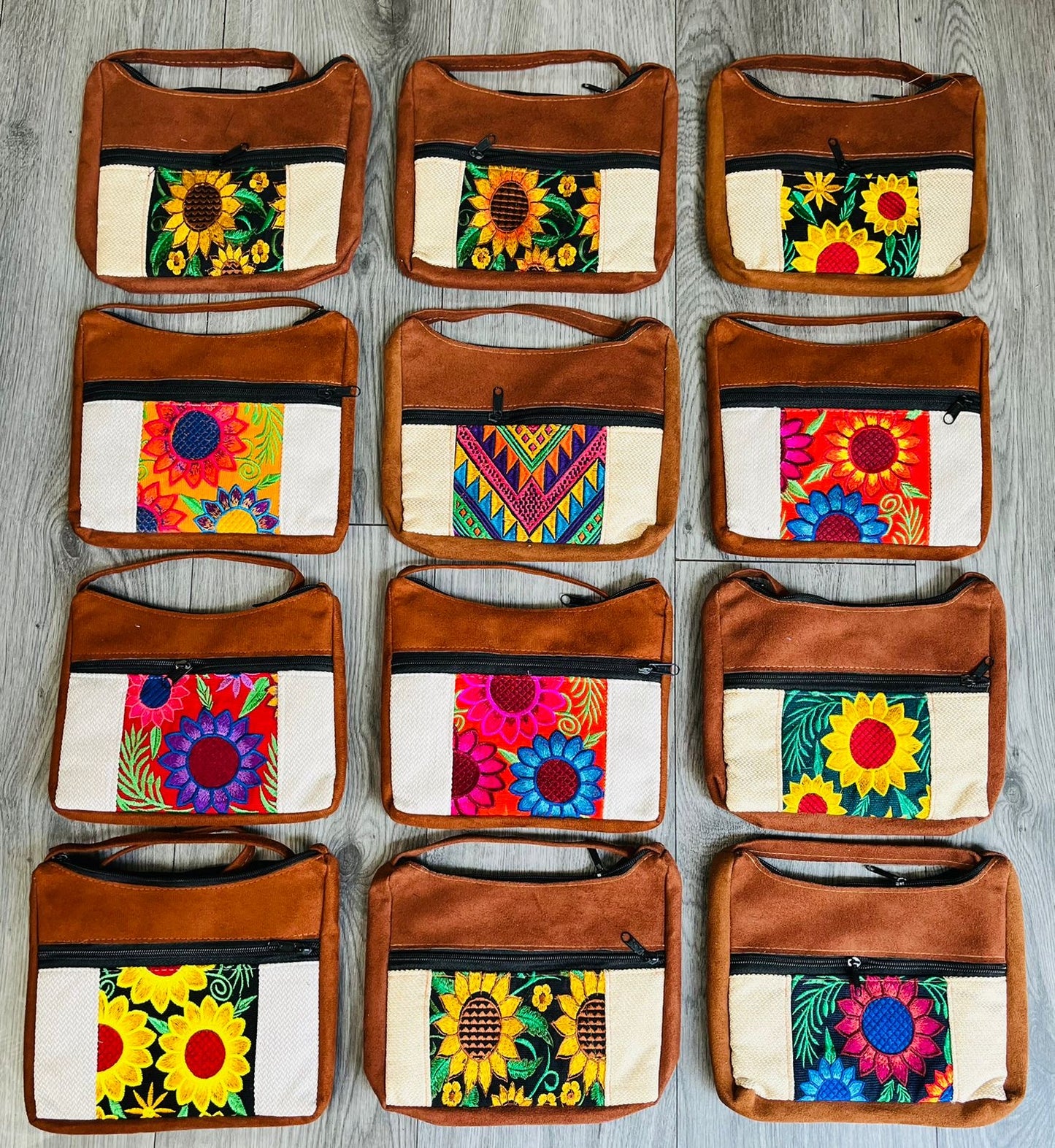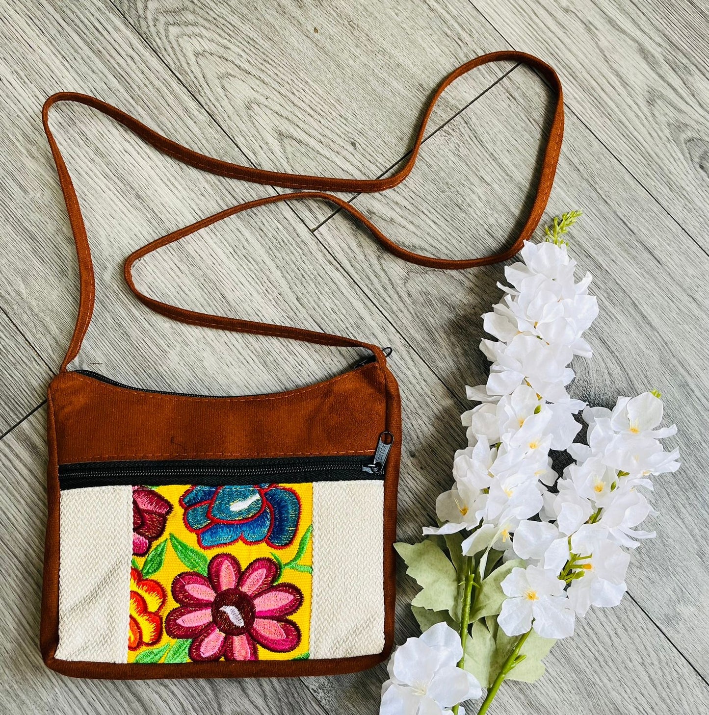 Bolsa en gamuza con detalles en tipo costal con bordado en medio.